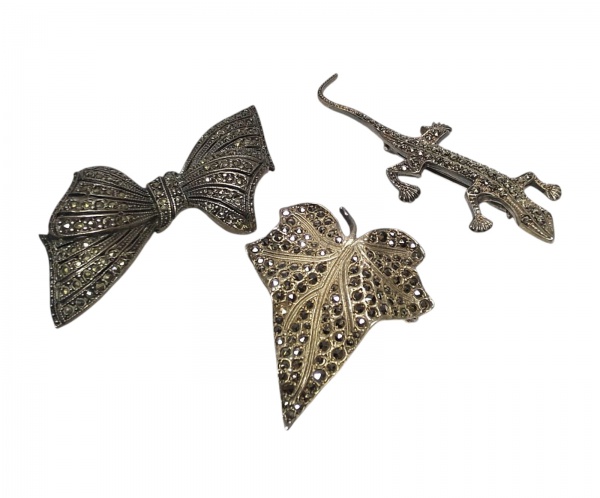 • LOTE COMPOSTO POR TRÊS BELÍSSIMOS BROCHES EM PRATA DE LEI, AMBOS COM DESIGN VINTAGE, RICA INCRUSTAÇÃO DE MARCASSITAS E FINO ACABAMENTO. MEDEM APROX 7,0 X 2,5 CM, 6,0 X 3,5 CM E 4,5 X 3,5 CM. AMBOS EM EXCELENTE ESTADO DE CONSERVAÇÃO.