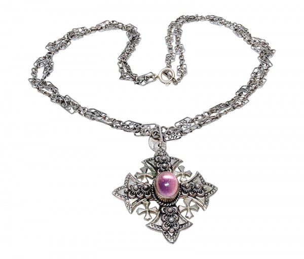 • MAJESTOSA E RARA CRUZ DE JERUSALÉM EM PRATA DE LEI TEOR 950, FEITIO DE EXCEPCIONAL OURIVESARIA COM RICO TRABALHO E FINO ACABAMENTO COM LINDO CABOCHON DE AMETISTA. MEDE APROX 4,6 CM DE DIÂMETRO. ACOMPANHA BELÍSSIMA  CORRENTE COM MALHA DUPLA E DESIGN EXCLUSIVO MEDINDO 60 CM DE COMPRIMENTO. CONJUNTO EM EXCELENTE ESTADO DE CONSERVAÇÃO. ORIGEM JERUSALÉM. NOTA: A cruz de Jerusalém, também conhecida como cruz quíntupla ou cruz e cruzetas, é uma variante da cruz cristã que consiste em uma grande cruz cercada por quatro cruzes gregas menores. Este símbolo, que representa os quatro evangelistas e a propagação do evangelho, era usado como emblema do Reino de Jerusalém e também como brasão de armas.