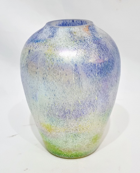 • Elegante e lindo vaso, executado em vidro artístico iridescente de ótima qualidade e manufatura. Design moderno e exclusivo. Perfeito estado de conservação. Mede 22,5 cm de altura x 7,0 cm de diâmetro do círculo da borda.