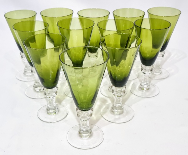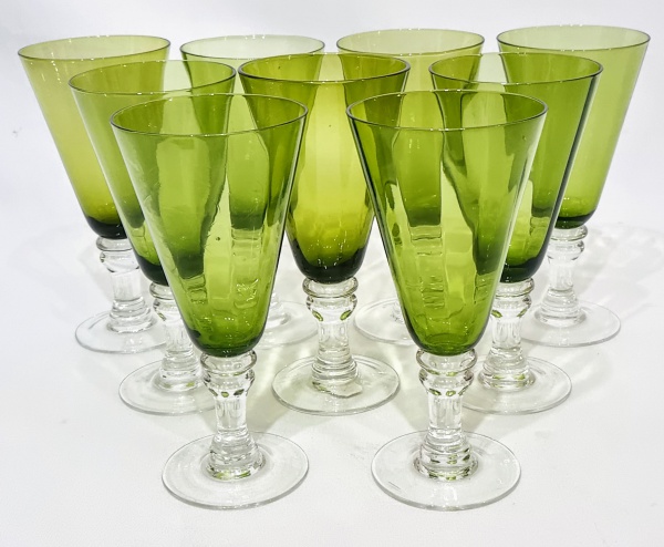 • Lindo e charmoso jogo de 8 grandes taças, executadas em vidro artístico de ótima qualidade, bojo em tonalidade verde e haste/base translúcida. Design moderno e exclusivo. Perfeito estado de conservação, medem 18,0  cm de altura x 8,0 cm de diâmetro da borda cada aproximadamente.