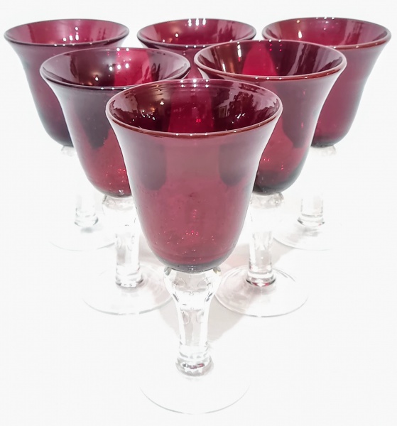 • Lindo e charmoso jogo de 6 grandes taças, executadas em pesado vidro artístico de ótima qualidade, bojo em tonalidade vermelho rubi e haste/base translúcida. Design moderno e exclusivo. Perfeito estado de conservação, medem 20,5 cm de altura x 11,5 cm de diâmetro da borda cada.