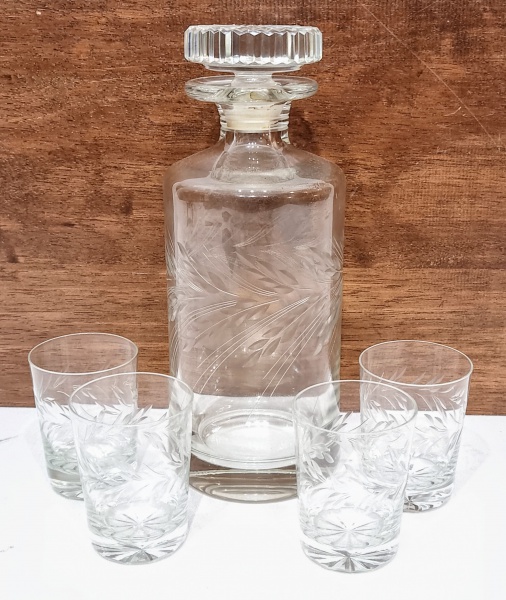 • Charmoso e lindo conjunto de botelha e 4 copinhos, ambos executados em cristal de ótima qualidade e manufatura nacional, adornados por clássica lapidação jateada trigo, tonalidade translúcida. Perfeito estado de conservação. Botelha mede 25,0 cm de altura x 10,0 cm de diâmetro da base, copinhos medem 8,0 x 6,0 cm.