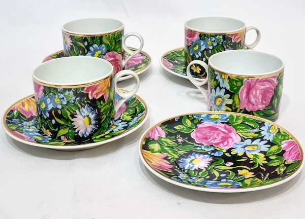 • Lindíssimo e elegante jogo de 4 xícaras para chá, feitas em porcelana de ótima qualidade e manufatura nacional, adornadas por bela pintura á mão com rico motivo floral e filetes á ouro. Perfeito estado de conservação, medem 6,5 cm de altura x 14,0 cm de diâmetro dos pires cada.