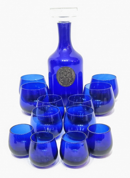 • Lindo e antigo jogo de botelha e 12 copos, feitos em vidrão artístico de tonalidade azul cobalto. Bom estado de conservação. Botelha mede 26,5 cm de altura x 10,0 cm de diâmetro da base, 4 copos medindo 5,5 cm de altura x 4,0 cm de diâmetro da borda, 4 medindo 6,5 x 5,5 cm e 4 medindo 7,5 x 7,0 cm.