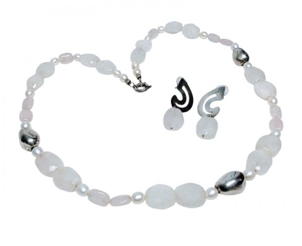 • MAJESTOSO COLAR EM BELÍSSIMO QUARTZO NATURAL LAPIDADO DE EXCELENTE QUALIDADE, DESIGN VINTAGE EXCLUSIVO DE EXCEPCIONAL OURIVESARIA COM RICO TRABALHO E FINO ACABAMENTO COM PÉROLAS NATURAIS E ELEGANTES CABOCHONS EM PRATA DE LEI. COLAR MEDE APROX 74 CM DE COMPRIMENTO. ACOMPANHA CHARMOSO PAR DE BRINCOS EM PRATA COM QUARTZO MEDINDO APROX  5,4 X 2,0 CM. CONJUNTO EM EXCELENTE ESTADO DE CONSERVAÇÃO.