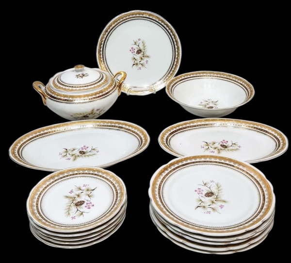 • STEATITA, BRASIL - Belíssimo aparelho de jantar e sobremesa, feito em porcelana de ótima qualidade e manufatura nacional. Peças adornadas por lindo motivo floral e riquíssimos filetes e coberturas á ouro. Composto por: 01 sopeira, 02 travessas ovais, 01 bowl, 01 prato para bolo, 05 pratos rasos para jantar e 05 para sobremesa. Ambos em bom estado de conservação. Sopeira possui discreto fio de cabelo. Pratos para jantar medem 24,0 cm de diâmetro e sopeira 15,0 cm de altura x 27,0 cm de alça á alça.