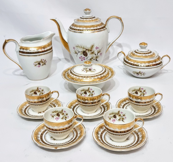 • STEATITA, BRASIL - Belíssimo aparelho de café, feito em porcelana de ótima qualidade e manufatura nacional. Peças adornadas por lindo motivo floral e riquíssimos filetes e coberturas á ouro. Composto por: 01 bule, 01 leiteira, 01 açucareiro, 01 manteigueira e 05 xícaras para café com seus respectivos pires. Ambos em bom estado de conservação. Bule mede 19,0 cm de altura x 22,5 cm de alça a alça. Xícaras medem 5,5 cm de altura x 10,5 cm de diâmetro dos pires.