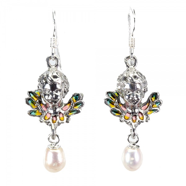• Elegante par de brincos em prata espessurada a ouro branco, design exclusivo de excepcional ourivesaria no formato de Querubins adornados por rico trabalho esmaltado e linda Pérola de 4.0 mm. Perfeito estado de conservação, sem uso. Medem 4,0 x 1,4 cm . origem Tailândia e África.