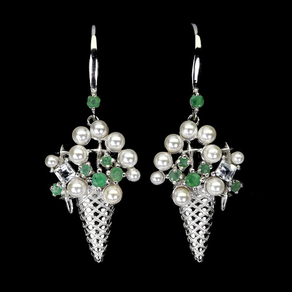 • Belo par de brincos em prata espessurada a ouro branco, design exclusivo de excepcional ourivesaria no formato de buque de flores adornadas por rico trabalho com esmeraldas de lapidação brilhante, fino acabamento com água marinha quadrada e lindas Pérolas mini de 2.5 mm. Perfeito estado de conservação, sem uso. Medem 4,2 x 1,6 cm . origem Tailândia, Brasil e Colômbia.