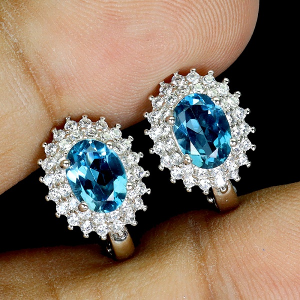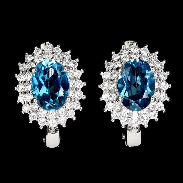 • Clássico e elegante par de brincos em prata de lei espessurada a ouro branco, design exclusivo de excepcional ourivesaria com belíssimo Topázio London blue de 7.0 x 5.0 mm, clássica lapidação oval brilhante, adornado por rico trabalho, fino acabamento e majestosas coroas de Zirconias extra brancas de lapidação brilhante. Perfeito estado de conservação, sem uso. Medem 1,2 x 1,0 cm. Origem África.