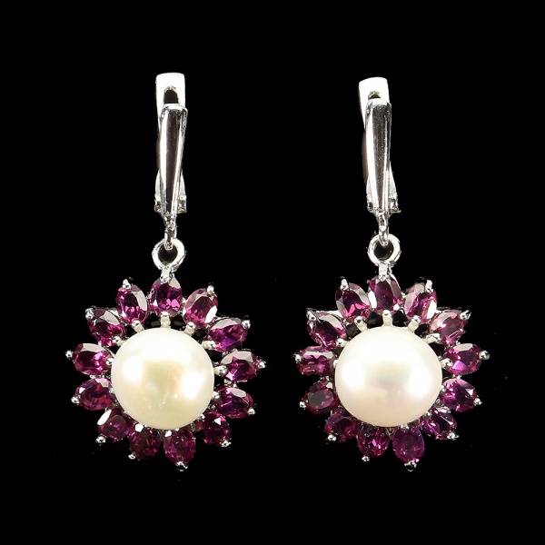 • Belíssimo par de brincos em prata de lei espessurada a ouro branco, design moderno exclusivo de excepcional ourivesaria com linda pérola barroca de 10 mm, adornada por rico trabalho e fino acabamento com majestosa coroa de Granadas Rodolitas de 4.0 x 3.0 mm clássica lapidação oval brilhante. Perfeito estado de conservação, sem uso. Medem 3,6 x 1,8 cm. Origem Tailândia e África.