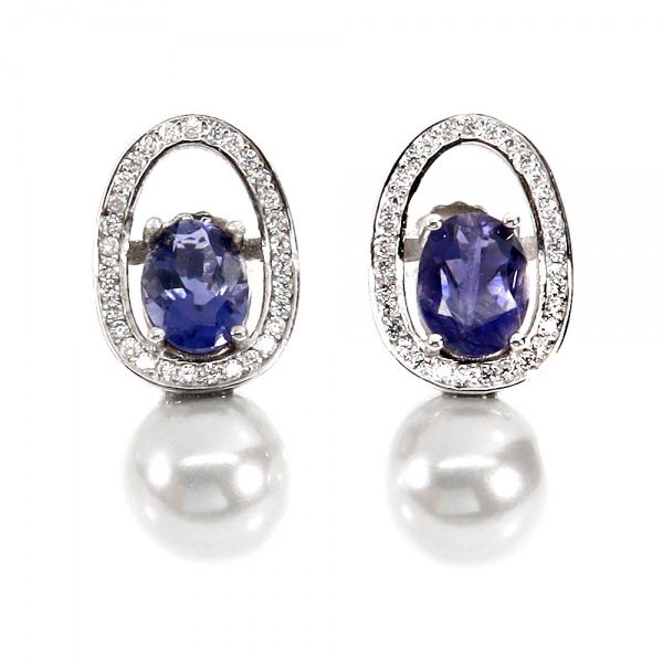 • Elegante par de brincos em prata de lei espessurada a ouro branco, design exclusivo de excepcional ourivesaria com bela Iolita de 8.0 x 6.0 mm, clássica lapidação oval brilhante, adornada por elegante coroa de Zirconias extra brancas, rico trabalho e fino acabamento com linda Pérola de 8.0 mm. Perfeito estado de conservação, sem uso. Medem 2,4 x 1,2 cm. Origem África e Tailândia.