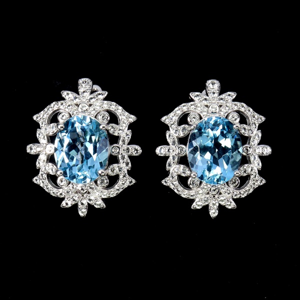 • Belíssimo par de brincos em prata de lei espessurada a ouro branco, design moderno exclusivo de excepcional ourivesaria com precioso Topázio Sky Blue de 10 x 8.0 mm, clássica lapidação oval brilhante, adornado por rico trabalho e majestosa coroa de Zirconias extra brancas com fino acabamento. Perfeito estado de conservação, sem uso. Medem  2,0 x 1,6 cm. Origem África.