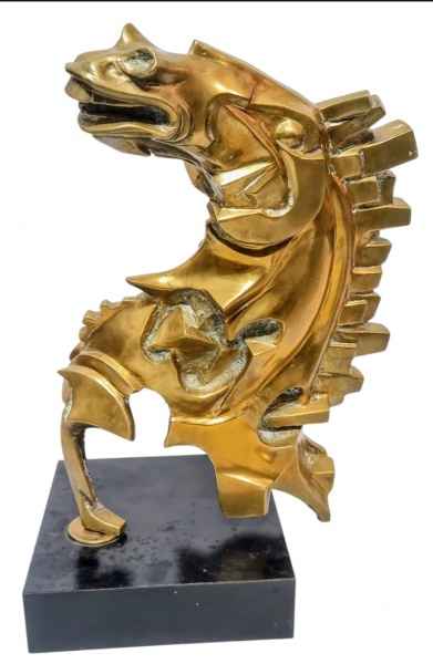 • JOSÉ GUERRA (Madrid, Espanha, 1941 - Santa Catarina, 2018) ) - Raríssima e imponente escultura, representando expressivo cavalo riquíssimo em movimentos, adornado por lindo trabalho e fino acabamento. Feito á mão em bronze patinado de excelente fundição e qualidade escultórica. Apoiada sobre base de madeira. Excelente estado de conservação. Mede 45,0 cm de altura x 22,0 x 22,0 cm da base. NOTA SOBRE O ARTISTA:  José Guerra (Espanha, 1941)Escultor, inicia muito cedo sua formação artística. Em 1952, ingressa na Escola de Artes e Ofícios de Madrid, onde permanece até 1958, recebendo orientação de importantes artistas espanhóis. A partir de 1956, estuda Escultura na Real Academia de São Fernando. Paralelamente, estuda Cerâmica e História da Arte. Muda-se para São Paulo em 1958, onde produz esculturas de bronze que têm como temas prevalentes cavalos e figuras humanas, sobretudo mulheres. Mostra seu trabalho em exposições individuais e coletivas realizadas no Brasil, entre elas o Panorama da Arte Atual Brasileira, no Museu de Arte Moderna de São Paulo MAM, Alemanha, Espanha e Estados Unidos. Possui obras instaladas em diversas instituições públicas e privadas no Brasil e foi autor de troféus destinados a premiados do Fundo das Nações Unidas para a Infância UNICEF. Suas esculturas geralmente não são realistas. Mediante rupturas na superfície de suas peças, ele possibilita a criação de sugestivos efeitos de luz e sombra. Teve como Professores ,grandes mestres como Antonio Cruz Callado, Cappa e José Espinós Alonso, este ultimo seu tio.Conquistou seu 1º Prêmio De Escultura em 1956, num concurso instituído na capital espanhola pela Escuela  de Artes de Calle de La  PalmaE em 1959, já no Brasil , recebeu uma Menção Honrosa ao participar do Salão Paulista de Belas Artes.Possui várias obras em locais públicos, entre elas na estação Santa Cecilia do metro em São Paulo e Imprensa Oficial do Estado .José Guerra teve algumas encomendas especiais de importância:  Criou o Premio São Silvestre(1.959),instituído pelo jornal A Gazeta Esportiva, para premiar os três melhores corredores daquela tradicional prova pedestre; O prêmio Jeca Tatu ( 1.979) instituído pela Agencia de Propaganda CBBA de São Paulo para premiar o melhor texto ou a melhor imagem brasileira; o Prêmio Bayer(1.981) ,criado pela Bayer do Brasil para Premiar os melhores pecuaristas brasileiros: o Prêmio Imprensa Oficial (1.982), destinado a premiar os melhores livros editados em São Paulo, sob o ponto de vista gráfico; e finalmente o Prêmio UNICEF (1.982) instituído pelo Fundo Das Nações Unidas para infância para homenagear personalidades e instituições que têm dedicado no mundo seu tempo e seu talento a causa da infância .Se dedicou a Escultura até os últimos dias de sua vida, deixando no seu acervo obras inéditas nas quais transparece todo seu amor e dedicação pela arte .